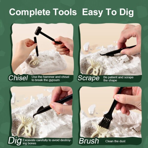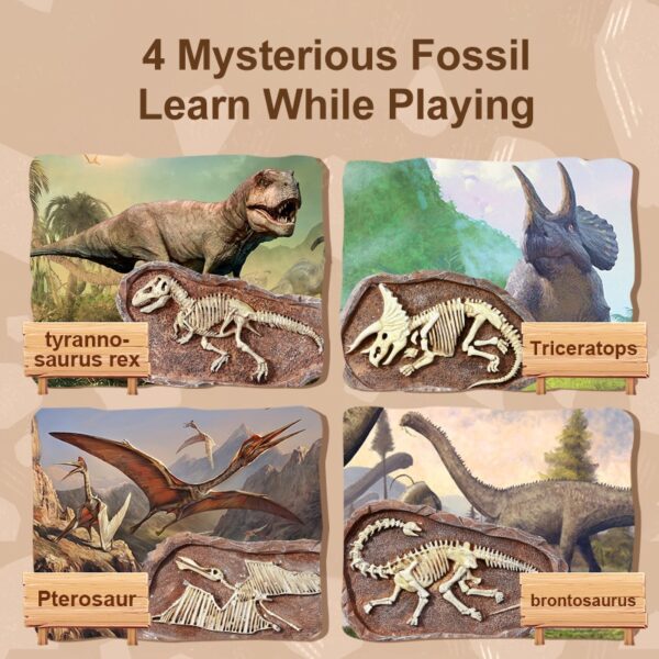 ได้สัมผัสกับความสนุกในการขุด พร้อมเรียนรู้เกี่ยวกับเหล่าไดโน (หลังคู่มือจะมีชื่อชนิดของไดโนเสาร์แต่ละชนิด)