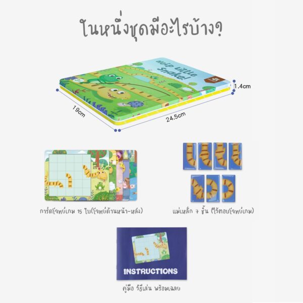 วิธีเล่น: ให้น้องๆต่อตัวเจ้างูน้อยตั้งแต่หัวไปถึงหาง โดยที่ทับสิ่งกีดขวางต่างๆ ที่อยู่บนการ์ดโจทย์